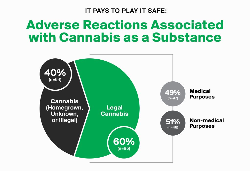 Why does this matter? Recent survey research shows that 27% of Canadians, aged 16 and older, reported using cannabis in the previous 12 months, up from 25% from the previous survey. There are about 40 million Canadians, so this data tells us approximately 10 million Canadians consumed cannabis, and only 159 adverse reactions were reported.